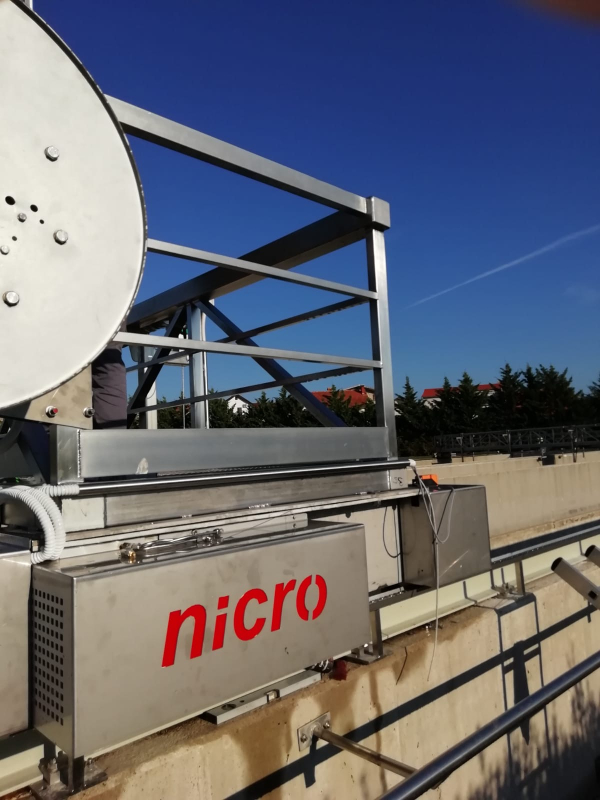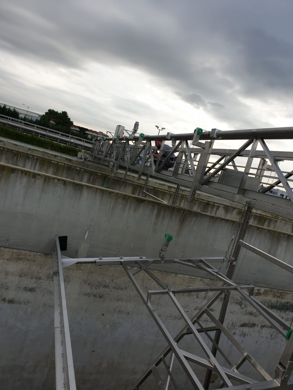 Deviations in the parallelism of the concrete walls were found in the basin of the subsequent clarifier. That is why special attention should be focused on high-quality guidance (with the help of rails) in the longitudinal direction. In addition, the construction of surface and bottom mud scrapers should be adapted in such a way that they have greater lateral clearance, which is compensated by longer rubber inserts. The guiding of the bridge is ensured by the correct placement of the rails and wheels with a reinforced edge for guiding along the rails. Bottom mud scrapers must be supported on the concrete base by means of appropriate wheels.